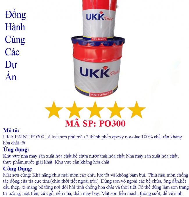 Sơn kháng hóa chất UKA PAINT PO300 Là loại sơn phủ màu 2 thành phần epoxy novolac,100% chất rắn,kháng hóa chất tốt Công thức tiên tiến thích hợp với sàn bê tông,sắt thép và tường,khu vực ngoài trời, bề mặt hoàn thiện không mạch nối,kháng hóa chất ,bề mặt bóng sáng,dễ dàng làm vệ sinh.Có nhiều màu sắc để lựa chọn