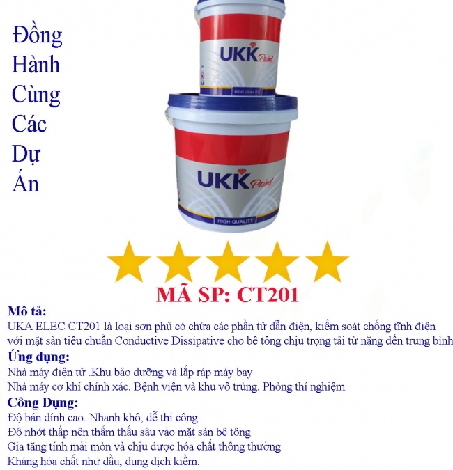 UKA ELEC CT201 là loại sơn phủ có chứa các phần tử dẫn điện, kiểm soát chống tĩnh điện với mặt sàn tiêu chuẩn Conductive Dissipative cho bê tông chịu trọng tải từ nặng đến trung bình