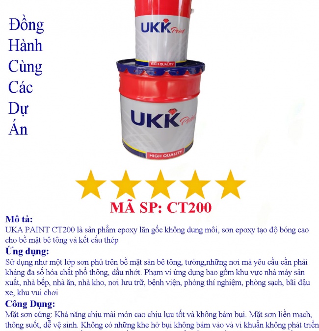 SƠN LĂN UKA PAINT CT200 là sản phẩm epoxy lăn gốc không dung môi, sơn epoxy tạo độ bóng cao cho bề mặt bê tông và kết cấu thép. Công thức tiên tiến thích hợp với sàn bê tông, sắt thép và tường, bề mặt hoàn thiện không mạch nối, kháng hóa chất phổ thông, bề mặt bóng sáng, dễ dàng làm vệ sinh. Có sẵn nhiều màu sắc để lựa chọn.