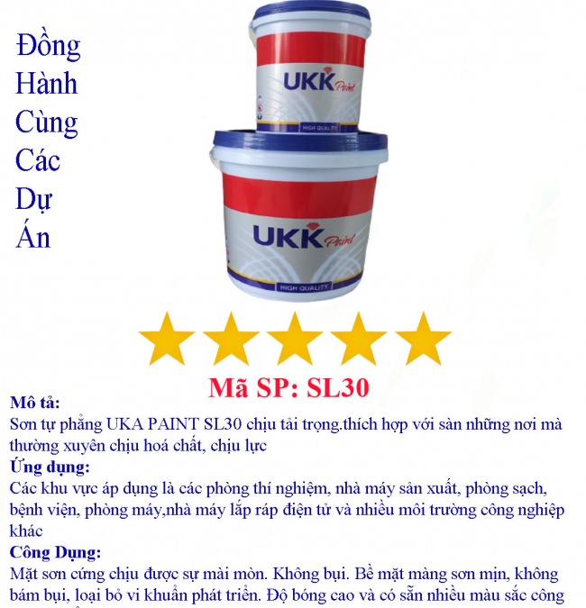 Sơn tự phẳng UKA PAINT SL30 có mặt sơn cứng chịu được sự mài mòn. Không bụi.Bề mặt màng sơn mịn, không bám bụi, loại bỏ vi khuẩn phát triển.Độ bóng cao và có sẵn nhiều màu sắc công nghiệp để lựa chọn